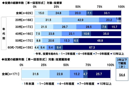 投資離脱者(171名)についてみると、投資の経験年数は、「1年未満」が31.6%、「1~3年程度」が22.8%で、合計した『3年以下で離脱』は54.4%となりました。また、「4~6年程度」は15.2%、「7~9年程度」は4.7%、「10年以上」は25.7%でした。
