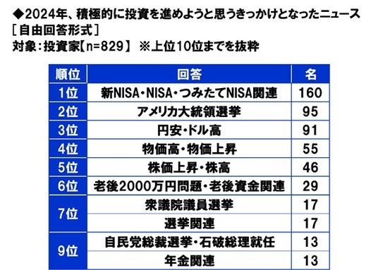 今年、積極的に投資を進めようと思うきっかけとなったニュースを聞いたところ、1位「新NISA・NISA・つみたてNISA関連」(160名)、2位「アメリカ大統領選挙」(95名)、3位「円安・ドル高」(91名)、4位「物価高・物価上昇」(55名)、5位「株価上昇・株高」(46名)となりました。
