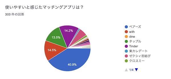 最も利用したことが多いアプリはPairs(ペアーズ)、2番目はwith(ウィズ)、3番目がtapple(タップル)という結果になりました。