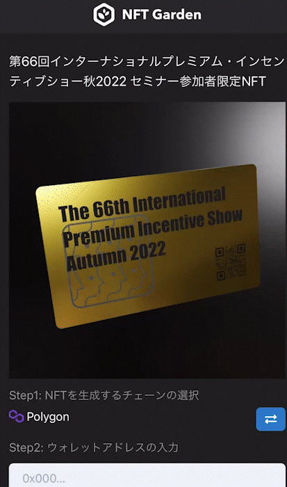 web3関連サービスの提供を行うConnectiv株式会社(代表取締役:石井 裕希、以下「Connectiv」)は、 マルチチェーン NFT生成プラットフォーム『NFT Garden』のAPI機能を使用し、「第66回インターナショナルプレミアム・インセンティブショー秋2022」において、イベント限定のマルチチェーンNFT配布を行いました。多くのユーザーがイベント会場にてNFTの受け取りを行い、NFTを使ったプロモーションの可能性を体感頂きました。また、NFT配布画面のソースコードは近日中にGitHubにて公開予定です。