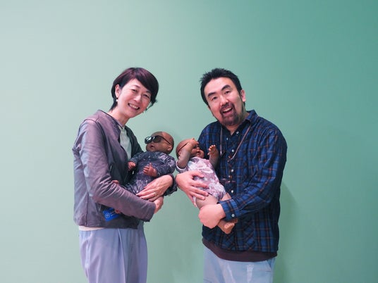 日本館にて展示される「赤ちゃん」人形を抱いて。 左:塩見有子(NPO法人アーツイニシアティヴトウキョウ[AIT / エイト]ディレクター)、右:荒川ナッシュ医
