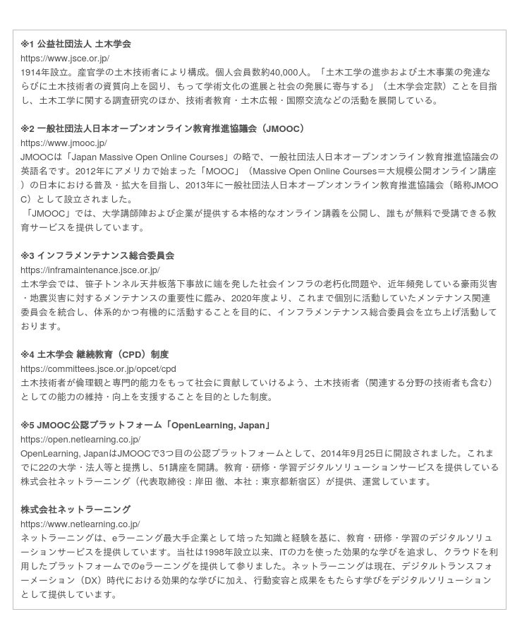尚、本講座は土木学会継続教育(CPD)制度の認定eラーニングで、どなたでも無料で受講することができます。受講期間について、前編は5月9日から6月6日まで、後編は6月6日から7月4日までの各4週間で、JMOOC公認プラットフォーム「Open Learning, Japan※5 」にて本日より受講申込を開始いたしました。