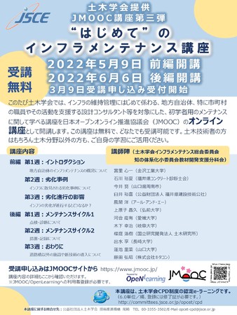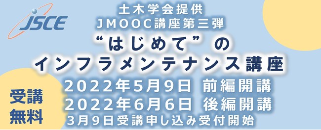 公益社団法人土木学会※1(会長 谷口 博昭)は、無料で学習できるオンライン講座「“はじめて”のインフラメンテナンス講座」を、一般社団法人日本オープンオンライン教育推進協議会(JMOOC)※2の講座として、金沢工業大学 宮里 心一 教授を主査とする土木学会インフラメンテナンス総合委員会※3 知の体系化小委員会 教材開発支援分科会による「“はじめて”のインフラメンテナンス講座(前編)」を2022年5月、「“はじめて”のインフラメンテナンス講座(後編)」を2022年6月に開講することを本日(2022年3月9日)発表いたしました。