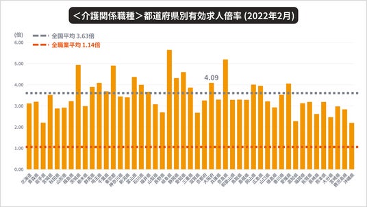 「大阪府における介護人材の有効求人倍率は、全国平均3.63を上回り、4.09倍」