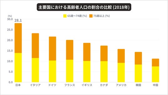 出典:2018年 総務省統計局 「5. 国際比較でみる高齢者」を元に、カイテク社にて作成。