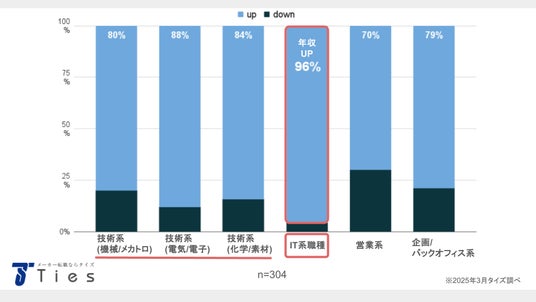 最も年収が上がったのは「IT系職」で96%が年収アップ。次いで、「技術系(電気/電子)」が88%、「技術系(化学/素材)」が84%と高い割合を示しました。職種ごとの差は大きくはなかったものの、「営業系」「企画/バックオフィス系」などの文系職種に比べ、「技術系」の方が年収アップしやすい傾向がみられました。
