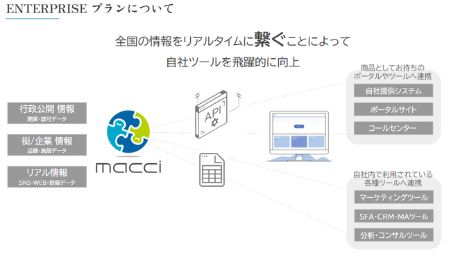 macciデータを、自社提供サービス(ポータルサイト等)や、自社が利用しているツール(CRM/SFA/MA等)に