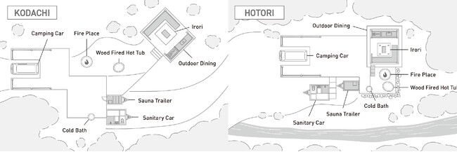駐車スペースにキャンピングカーを接続させることによって完成する2つのサイトは、木立に囲まれた「KODACHI」と、川の畔にある「HOTORI」があります。デッキにはダイニングやキッチンを完備し、隣接するサニタリートレーラーやサウナトレーラー、露天風呂など、充実した設備を揃えています。