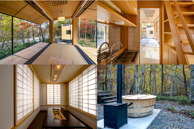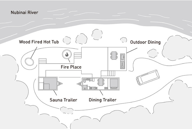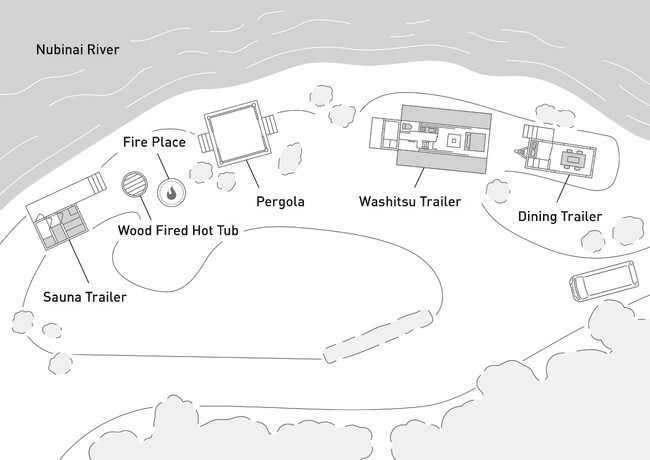 ・サイト構成:客室トレーラー(和室)、ダイニングトレーラー、薪式露天風呂、サウナトレーラー(水風呂付き)、ファイヤープレイス、アウトドアリビング