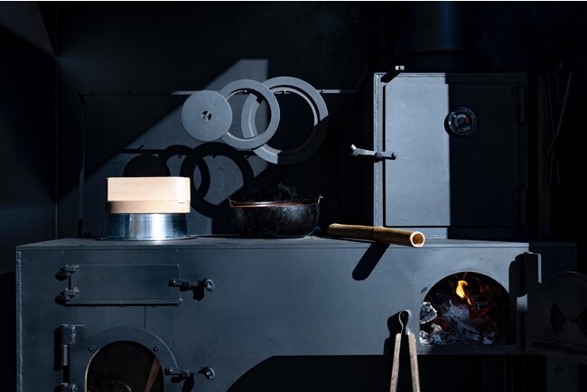 トレーラーハウスの屋上に備えた露天風呂の他、屋外スペースには薪式露天風呂を設置。大人2人がゆうに入れる木桶浴槽は滋賀の木桶職人、中川周士氏の手仕事によるもの。700年以上にわたり受け継がれている伝統的な技法を用い、木本来の表情を色濃く残した「割れ肌仕上げ」で作られています。