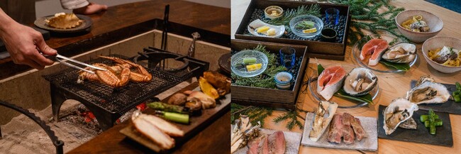 お食事は北海道出身の料理人、森枝幹氏の監修により、地元十勝の食材を使った3種類のコースメニューを提供しています。シェフがダイニングトレーラーの囲炉裏を使いながら料理を振る舞う「シェフズコース(※NAGAMEのみ)」、スタッフによる調理サポート付きの「セミセルフコース」、さらにお客様ご自身で調理が楽しめる「セルフコース」をご用意しています。