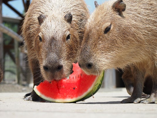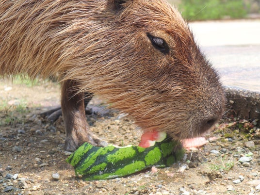 カピバラたちも熱中症対策。スイカを食べてしっかり水分補給!大好きなスイカへかぶりつきシャクシャクと夢中で食べる姿は可愛くて見ているだけで癒されます。