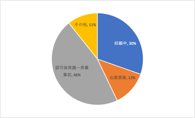 待機児童が改善された最近でも保活は早い時期から始める人が少なくありません。割合としては「認可保育園の一斉募集の前」がもっとも多いものの、次に多かったのが「妊娠中から」という人で30%、「出産直後」という人も13%いました。