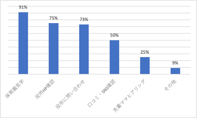 早期から保活を始める人が多い一方で、その保活の内容には最近の特徴が表れています。「保育園落ちた死ね」で話題になった数年前の保活と言えば何とかして認可保に入園させるための活動で、入園のための点数を稼ぐ、申し込み用紙に近隣の保育園を片っ端から記入するといったことが一般的でしたが、保育環境が懸念される昨今の事情もあり、安心・安全な保育園に預けたいという思いが強くなり、情報収集や見学などでその質を見極めるための活動に変化してきているようです。実際に「保育園見学」をしたと回答した人は91%にのぼり、中には「地域の子育て支援センターにいる職員に市内の保育園の特徴を聞いた」などリアルな情報収集に励む人もいました。
