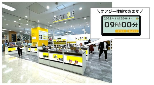 そんな中で、イオンリテール株式会社が、シニアの方々を日々サポートしている、ご家族や支援者の悩みや課題の解決を目的としたプラットフォーム「MySCUE」の実店舗の立ち上げと「ケアびー」店頭展示のお話を頂き、「MySCUE」実店舗による周知を通じて、対象者の課題解決に貢献出来ると考え、展示することと致しました。