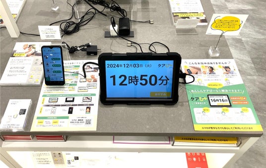 Hubbit株式会社は、2024年9月にイオンリテール株式会社として初めてオープンした介護サービス特化型店舗の「MySCUE」イオン品川シーサイド店にて、弊社製品である「ケアびー」を2024年12月~2025年3月まで店頭展示致しました。これまでも、介護事業者等向けには介護・福祉関連の展示会などで、出展して参りましたが、「ケアびー」の店頭展示はHubbit株式会社として初めての試みとなります。
