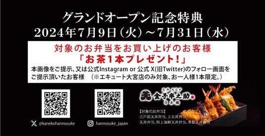 人気飲食店、つけ麺「つじ田」や、「中華そば専門 田中そば店」などをグループで運営する、オイシーズ株式会社(所在地:東京都 千代田区 、代表取締役:工藤 智)傘下の株式会社 and RICEは埼玉県初の常設店舗出店となる「日本橋 天丼 天むす 金子半之助 エキュート大宮店」(テイクアウト専門常設店)を 2024年7月9日 (火) にグランドオープンいたします。