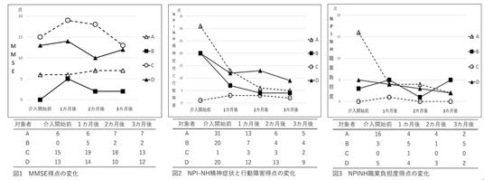 心理検査の実施について、介入開始前、1ヵ月後、2ヵ月後、3ヵ月後に、MMSEを研究者が患者に実施しました。また、1ヵ月後、2ヵ月後、3ヵ月後に、患者を援助した看護師が、NPI-NHとQLDJで患者を評価しました。なお、NPI-NHとQLDJを評価する看護師は一人に固定しました。介入開始前、開始1ヵ月後、2ヵ月後、3ヵ月後で、各心理尺度の評価の変化を評定しました。