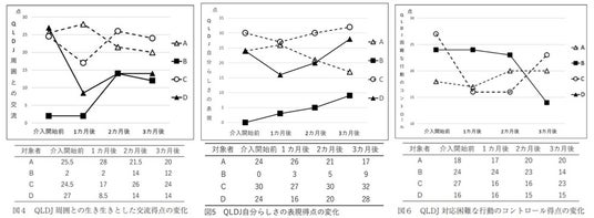 難聴を伴う認知症患者4名に対し、コミューンを使用した看護師の3か月間の介入により、2名で認知機能(MMSEスコア*図1)が改善し、2名で認知症に伴う行動・心理症状(NPI-NHスコア*図2・3)の軽減が確認されました。生活の質(QLDJ*図4・5・6)では、1名で周囲との生き生きとした交流、3名で自分らしさの表現、1名で対応困難な行動のコントロールの向上が見られました。