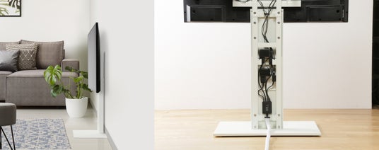 賃貸でも壁を傷つけずに壁掛け風にテレビを設置できるため、すっきりした空間を実現します。テレビ周りの配線を支柱の裏に隠すことで、生活感のある「ごちゃつき」を一掃。