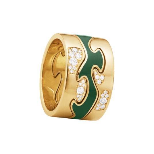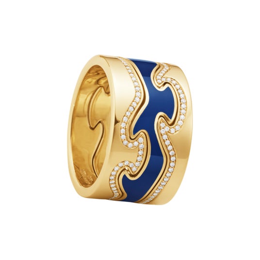2000年にジョージ ジェンセン初の18Kゴールドのみのジュエリーコレクションとしてデビューして以来、「フュージョン」はタイムレスで洗練されたメゾンのアイコンとして確固たる地位を築いてきました。コレクションの中心は、デンマークの著名なテキスタイルデザイナー、ニナ・コッペルが1987年に発表した作品にインスパイアされたリングです。このリングは、特徴的な波状の輪郭を持つエンドリングとセンターリングが複雑に絡み合い、無数の組み合わせを生み出します。このユニークなデザインにより、「フュージョン」は他に類を見ないジュエリーとなり、真の自分だけの“シグネチャー”を表現することができます。