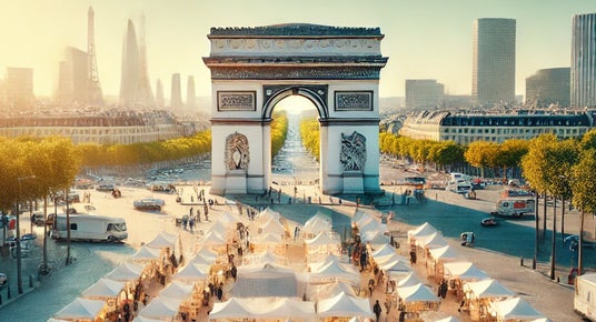 エッフェル塔と凱旋門。パリの代表的ランドマークの華やかな画とともに日本の魅力を発信。