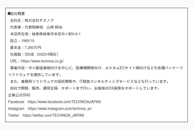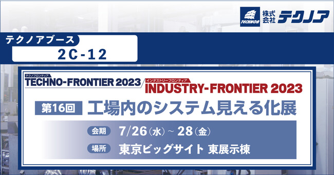 株式会社テクノア(本社:岐阜県岐阜市、代表取締役:山崎 耕治、以下:テクノア)は、7/26~28に 東京ビッグサイト 東展示棟で開催される「TECHNO-FRONTIER2023」の構成展「 INDUSTRY-FRONTIER2023 - 第16回 工場内のシステム見える化展」に出展いたします。