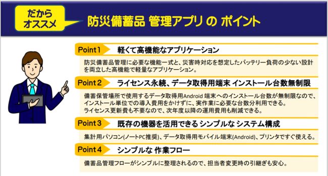新入社員の配属・異動など人員の増減が落ち着く今こそ、「防災備蓄品の保管場所・備蓄数が適切か確認する」「防災備蓄品の導入を検討する」最適な時期と考え、「防災備蓄品管理アプリ」<30日間無料体験版>の提供を開始しました。