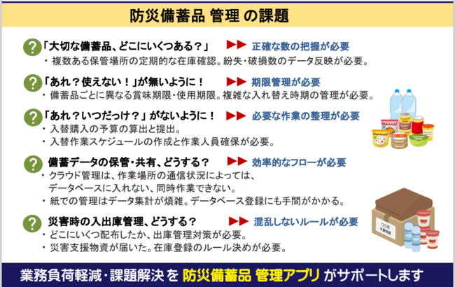 「防災備蓄品管理アプリ」は、長期に渡る「いざという時の備え」を確実に運用できる、「負荷の少ない業務フロー策定」をサポート。更に、導入検討の負荷もサポートする為、<30日間無料体験版>の提供を開始!