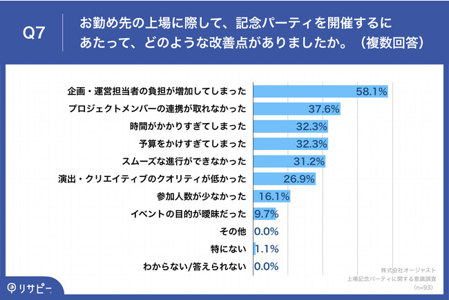 Q1で「ある」と回答した方に、「Q7.お勤め先の上場に際して、記念パーティを開催するにあたって、どのような改善点がありましたか。(複数回答)」(n=93)と質問したところ、「企画・運営担当者の負担が増加してしまった」が58.1%、「プロジェクトメンバーの連携が取れなかった」が37.6%、「時間がかかりすぎてしまった」が32.3%、「予算をかけすぎてしまった」が32.3%という回答となりました。