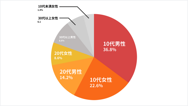 「あのガチャ」プレイユーザーに関しても、全体の利用者年齢割合と大差なく、10~20代が8割以上を占める形となりました。