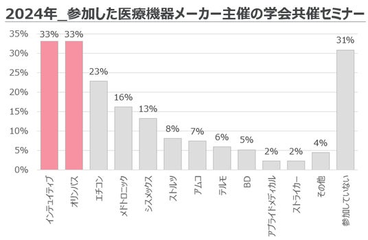 結果は1位「インテュイティブ」「オリンパス」が33%と拮抗、2位「エチコン」が23%、3位「メドトロニック」が16%、4位「シスメックス」が13%、5位「ストルツ」が8%、6位「アムコ」が7%、次いでテルモ、BD、アプライドメディカル、ストライカーという順になった。2023年と比較した参加頻度は平均で約10%増加した。