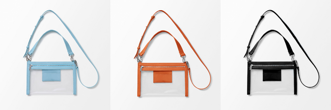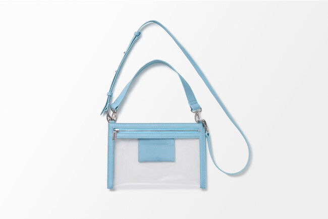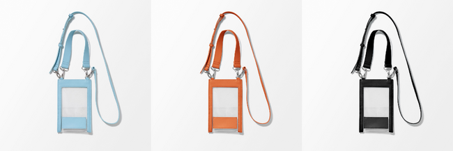 アップルレザー×PVCの異素材のコンビネーションが目を引く、夏らしいデザインとなっています。バッグは、財布やリップなど貴重品を入れるのにぴったりのショルダーポーチと、ちょっとしたおでかけに便利なスマートフォンショルダーの2種類です。取り外し可能な短いハンドルと、長さ調整が可能なショルダーストラップが付属しており、シーンやファッションに合わせて使用いただけるほか、中身が見えるので、旅行中のバッグインバッグとしても活躍します。コインケースにはボタンが付いており、スーツケースやバッグの目印としても使用できます。ブルー、レッド、ブラックの3色展開です。