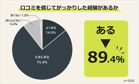 全国の男女500人に、口コミを信じてがっかりした経験があるか聞いたところ、「よくある(14.0%)」「たまにある(75.4%)」が合わせて89.4%にのぼりました。