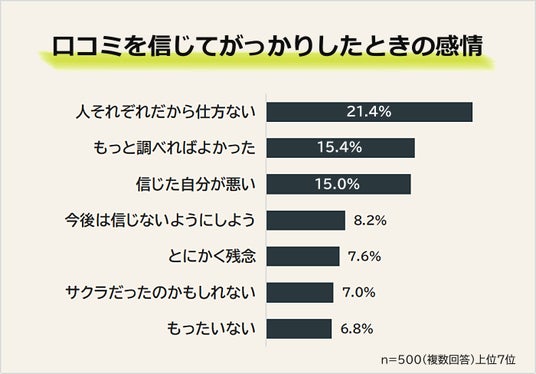口コミを信じてしまった自分が悪いと感じる人も多くなりました。つまり「口コミに期待しすぎたことへの後悔」や「自分の判断の甘さに対する内省」です。
