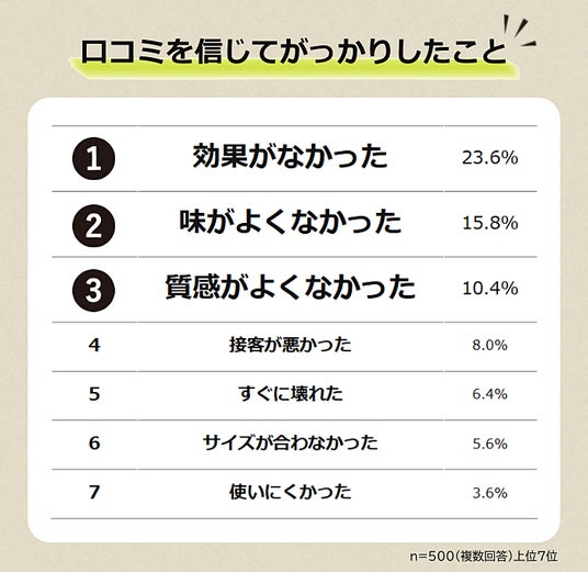 口コミを信じてがっかりしたこと1位は「効果がなかった」