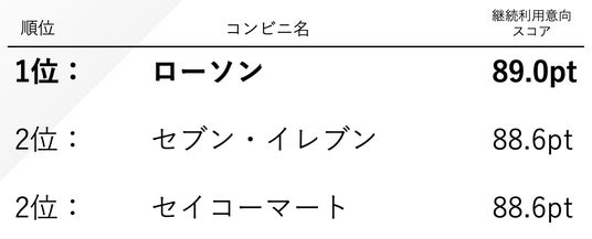 継続利用意向1位は、僅差で「ローソン」でした。コンビニ利用が習慣化していることもあってか、どの企業も継続利用意向は高く、顧客からの支持は高いことがわかりました。