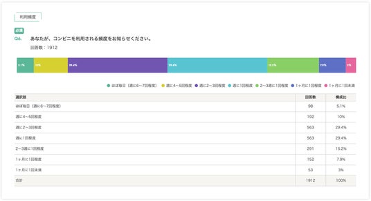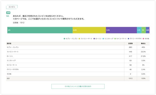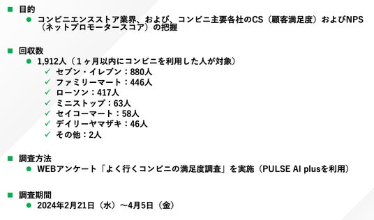 コンビニ主要6社である「セブン・イレブン」「ファミリーマート」「ローソン」「ミニストップ」「セイコーマート」「デイリーヤマザキ」の内、最近どのコンビニを利用したかを質問し、そのコンビニについて利用満足度を質問するというアンケートになっています。