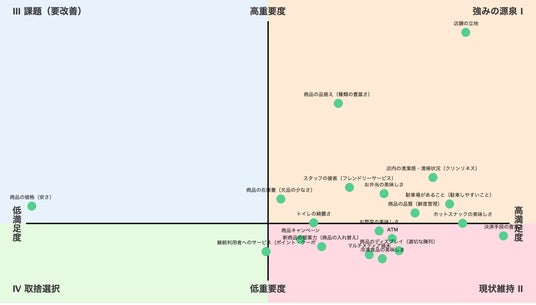 重要度×満足度の視点で、各項目が位置付けをマッピングしたグラフがCSマトリクスです。