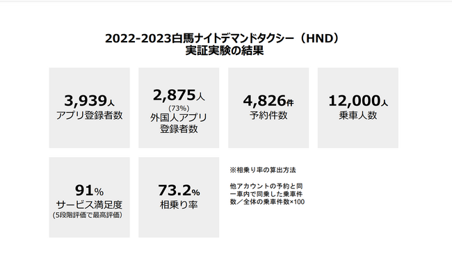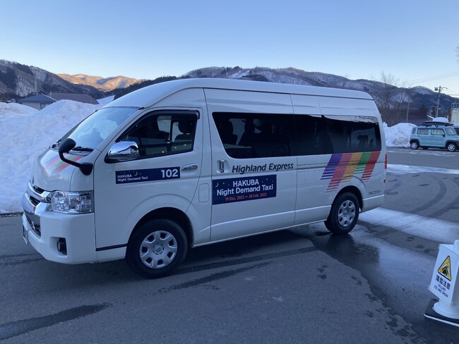 昨冬に白馬村が運行したAIオンデマンド乗合タクシー「白馬ナイトデマンドタクシー(HND)」は多くの観光客や地域住民が利用し、約70日間の運行期間で、アプリ登録者数は3,939人(うち外国人2,875人)、累計乗車人数は12,000人に達しました。また、高い運行効率(相乗り率 73%)とサービス満足度(91%が星5つの評価)を記録し、冬の観光の足として、白馬村の賑わいに大きく貢献いたしました。