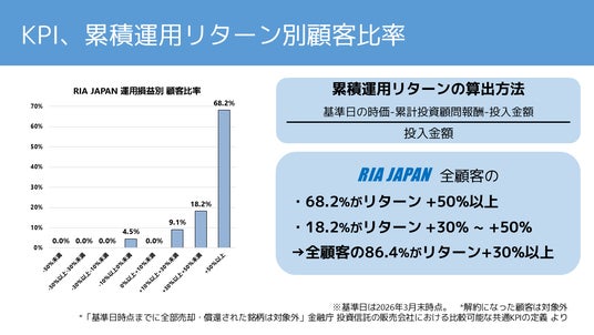 2026年3月末時点での顧客計数速報値である累積リターン平均+104.58%、顧客年間リターン平均26.51%等を公表しました。