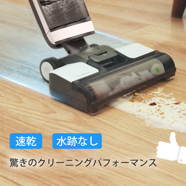 先進的なセンサーで吸引力と水の流れを自動調整し、掃除機と水拭きが同時に行えるので掃除時間を短縮できます。ケチャップ、ミルク、離乳食なども綺麗に掃除し、床を即座に乾燥させるため、水垢も残しません。