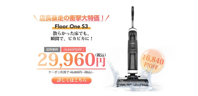 「吸引」と「水拭き」が一体型フロアクリーナー・乾湿両用水拭き掃除機Floor One S3は店内セール価格29,960円で提供された上に、500円オフの限定クーポンで最大36%OFFとなります。