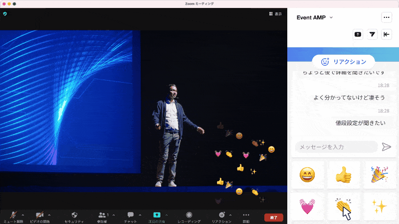 拍手音付きのリアクションボタンで臨場感アップ。音声を出す/出さないの切り替えは主催者様が任意のタイミングで行えます。