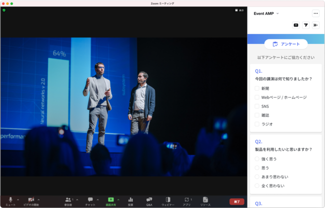 EventAMP(イベントアンプ)とは、Zoomの画面上にアンケートやサイトURL、資料ダウンロードなど様々な情報を自由に掲載することができるZoom公式アドオンです。