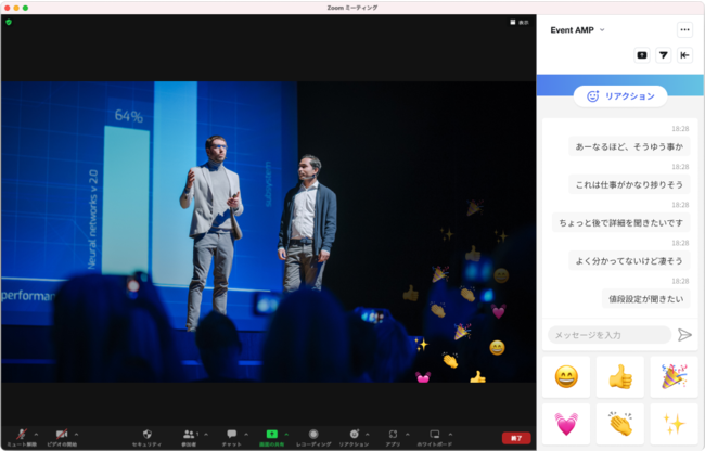 アーカイブ、セミナー概要や面談予約機能のほか、テレビ番組のようなテロップや音声付きリアクションでイベントの臨場感もアップ。Zoom配信の音声・映像品質そのままに、イベント体験をアップデート。