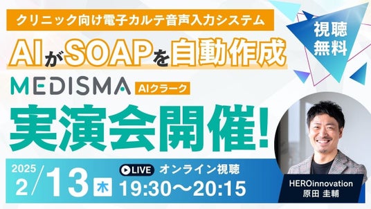 株式会社HERO innovation(本社:福岡県福岡市、代表取締役:平野義和、以下「当社」)は、生成AIを用い、医療機関のカルテ作成業務を支援する「メディスマAIクラーク」の具体的な使用方法やデモンストレーションをご覧いただけるWebセミナーを開催致します。