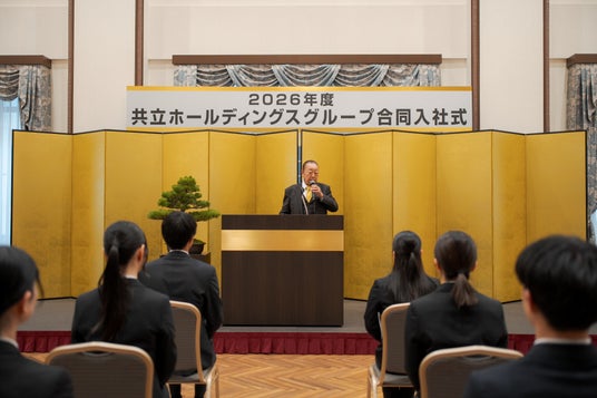 日本カルミック株式会社(本社:東京都千代田区、代表取締役社長:高居隆章、以下「当社」)は、2026年4月1日(水)、九段会館テラスにて共立製薬株式会社と合同で入社式を開催し、当社は9名の新入社員を迎えました。当日は会場全体が合同開催ならではの活気にあふれ、新入社員たちは真剣な面持ちで社長のメッセージに耳を傾け、社会人としての決意を新たにしていました。