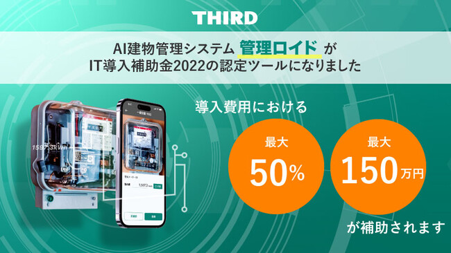 株式会社THIRDが提供するAI建物管理クラウドシステム「管理ロイド」が、「IT導入補助金2022」(「サービス等生産性向上IT導入支援事業」通常枠A類型)の対象に認定されたことをお知らせいたします。本認定により、「管理ロイド」の導入における費用に対し50%以内が補助対象となり、30万円以上150万円未満を補助金額とすることができます。