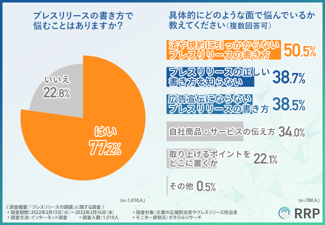 「プレスリリースの書き方で悩むことはありますか?」と質問したところ、8割近くの方が『はい(77.2%)』と回答しました。